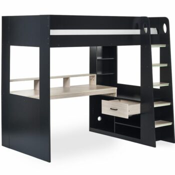 The Kimbo Cabin Bed is available in a choice of colours to suit all styles. The Kimbo has been designed with a pull out desk, a 3 drawer chest and shelving unit for books etc. The product also takes a standard UK single mattress (90cm x 190cm).